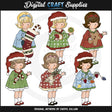 Esta colección única solo está disponible en Digital Craft Supplies. Este conjunto incluye seis niñas adorables, con bonitos vestidos de lunares y copos de nieve, lazos para el cabello a juego y gorros de Papá Noel, en rojo, verde, azul y blanco, un calcetín navideño con bastón de caramelo, galletas navideñas escarchadas, un hombre de jengibre, un bastón de caramelo, rama de acebo con galleta en forma de estrella y coloridas luces navideñas. Este conjunto exclusivo contiene 6 gráficos.