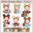 Esta colección incluye seis adorables niñas con vestidos con volantes, bonitos lazos para el cabello, un cuenco lleno de galletas navideñas decoradas y bastones de caramelo, un hombre de jengibre, bastones de caramelo, un árbol de Navidad, un soldado de juguete, un hilo de luces navideñas, regalos envueltos con bonitos lazos, una media llena de golosinas, una piruleta de menta y un borde navideño a juego. Este conjunto contiene 7 gráficos.