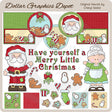 Esta gran colección incluye a Papá Noel, la Sra. Claus, un bastón de caramelo, muérdago, galletas de jengibre, galletas de estrellas navideñas, una galleta de muñeco de nieve, una taza navideña, un corazón de menta, un calcetín navideño, dos adornos para bolsos a juego, tres plantillas redondas a juego, cuatro mosaicos de fondo y un gráfico de palabras "Have Yourself A Merry Little Christmas". Este conjunto contiene 23 gráficos.