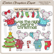 Esta colección incluye adorables ratones navideños en pijama, un ratoncito navideño con una media, un bastón de caramelo, un árbol de Navidad decorado con una estrella dorada en la parte superior, un letrero que dice: "Las medias estaban colgadas" con medias navideñas y un "Twas". Gráfico de arte de palabras "La noche antes de Navidad". Este conjunto contiene 9 gráficos.