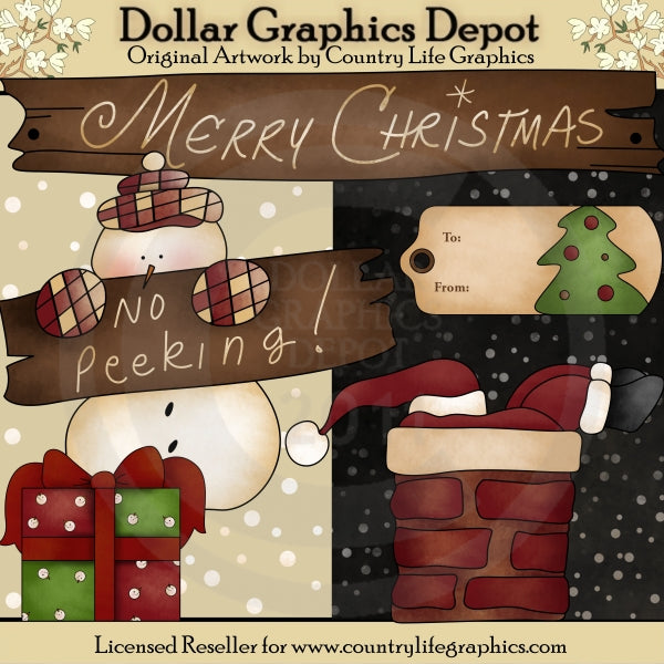 Esta colección incluye un bonito cartel de madera con el texto "Feliz Navidad", un muñeco de nieve con gorro de invierno, manoplas y un cartel de madera con el texto "No mirar", una bonita etiqueta de regalo con un árbol de Navidad, Papá Noel deslizándose por una chimenea, un Regalo de Navidad con un bonito lazo, nieve que cae y un papel de fondo de una noche nevada de 8" x 8". Este set contiene 7 piezas (6 gráficos y uno imprimible).