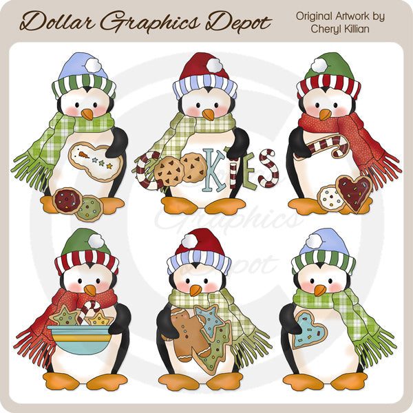 Esta colección incluye adorables pingüinos navideños, envueltos en gorros y bufandas de invierno, con galletas navideñas escarchadas, un cuenco pintado lleno de galletas navideñas y un gráfico con la palabra "Cookies". Este conjunto contiene 6 gráficos.