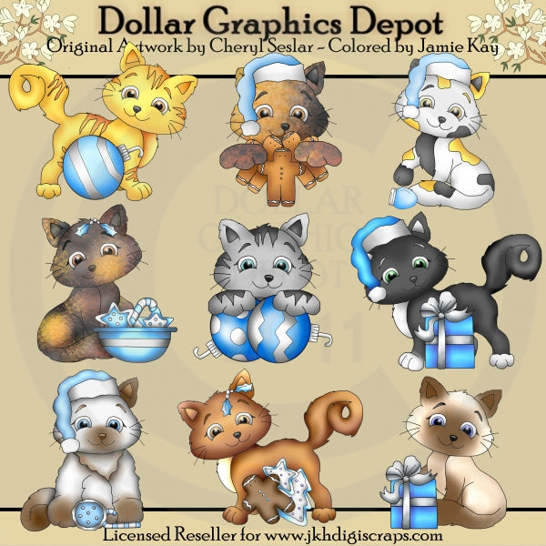 Esta colección incluye nueve adorables gatitos, en marrón, dorado, naranja, gris, negro, blanco, tostado y gris pardo, con bonitos adornos navideños, gorros de invierno, galletas navideñas escarchadas, regalos navideños envueltos, muñecos de jengibre y una bombilla navideña. y un plato de galletas navideñas decoradas. Este conjunto contiene 9 gráficos.
