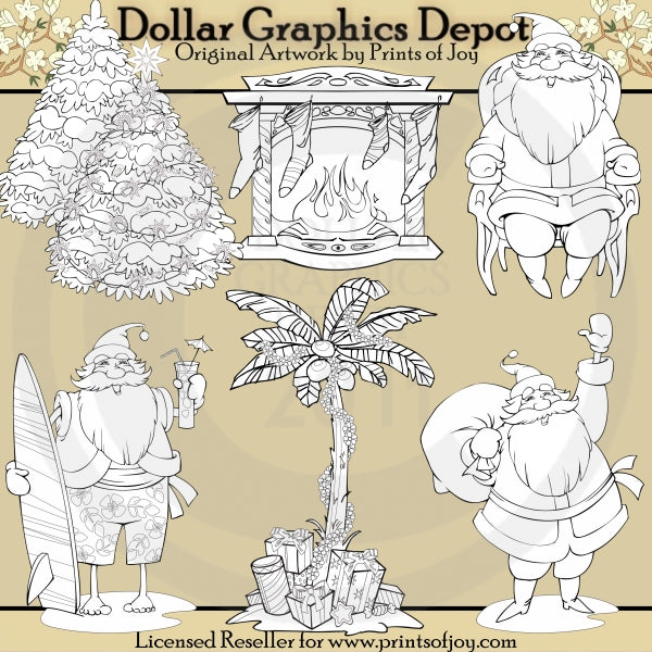 Esta colección incluye un árbol de Navidad decorado con nieve, luces navideñas y una estrella en lo alto, un árbol de invierno nevado, una chimenea con fuego de leña y medias colgadas, Papá Noel sentado en una silla, Papá Noel saludando con un saco lleno de Juguetes navideños, un Papá Noel tropical con pantalones cortos hawaianos, una tabla de surf y un batido tropical con una sombrilla, y una palmera decorada con regalos navideños envueltos en la arena. Este conjunto contiene 7 sellos digitales.