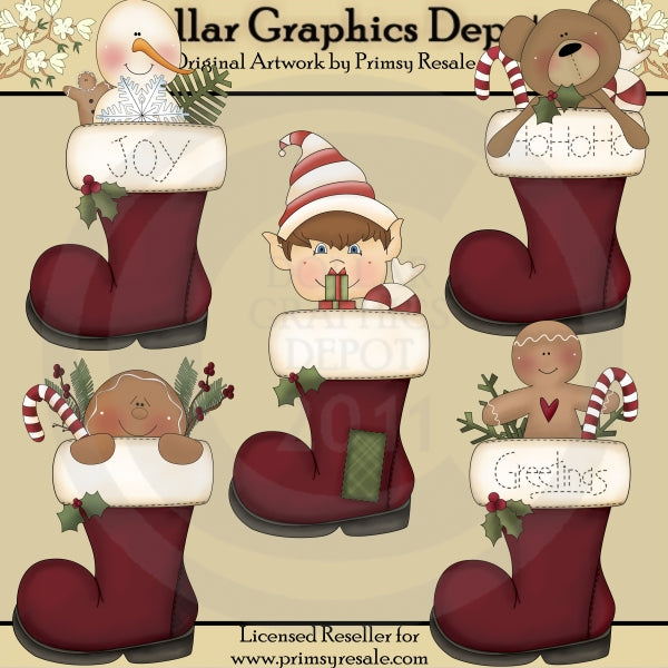 Esta colección incluye cinco lindas botas de Papá Noel: una con costuras "Joy", un muñeco de nieve, un hombre de jengibre, una rama de pino y un copo de nieve, una con un parche verde, un elfo, caramelo de menta y pequeños obsequios de Navidad, uno con "Ho Costuras "Ho Ho", un osito de peluche, caramelo de menta y un bastón de caramelo, uno con un hombre de jengibre, ramas de bayas de acebo y un bastón de caramelo, y otro con costuras "Saludos", un hombre de jengibre, ramas de pino y un caramelo. caña. Este conjunto contiene 5 gráficos.