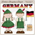 Esta colección incluye un niño alemán, una niña alemana, una bandera alemana, un frasco de chucrut y un gráfico con la palabra "Alemania". Este conjunto contiene 5 gráficos.