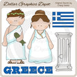 Esta colección incluye un niño griego con un pez, una niña griega, una bandera griega, un pilar y un gráfico con la palabra "Grecia". Este conjunto contiene 5 gráficos.