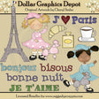 Esta colección incluye la Torre Eiffel con una bandera francesa en la parte superior, dos lindas niñas francesas con pequeños caniches, una botella de perfume, una taza de café, un croissant y 5 gráficos parisinos con palabras: "J' Amour Paris (I Love Paris)," Bonjour (Hola)", "Bisous (Besos)", "Bonne Nuit (Buenas noches)" y "Je T' Aime (Te amo)". Este conjunto contiene 11 gráficos.