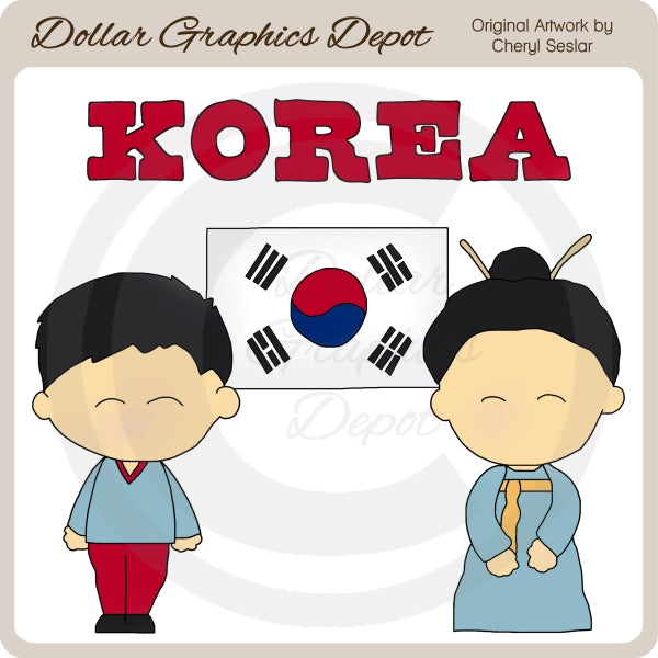 Esta colección incluye un niño coreano, una niña coreana, una bandera coreana y un gráfico con la palabra "Corea". Este conjunto contiene 4 gráficos.