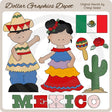 Esta colección incluye un niño mexicano con un sombrero y un poncho, una niña mexicana con un bonito vestido con volantes y un postizo de rosa, una bandera mexicana, una moraca, una bonita rosa roja, un cactus y un gráfico con la palabra "México". Este conjunto contiene 7 gráficos.