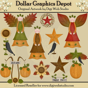 Esta colección incluye dos ángeles otoñales y una niña otoñal, con bonitos vestidos en naranja, verde, marrón y rojo, con hermosas alas de hojas de colores otoñales, dos cuervos negros con una estrella y un girasol, una colorida corona de estrellas, una calabaza ornamental colgando con un letrero de país que dice "Otoño", un bonito girasol con hojas de colores otoñales, una estrella con un letrero de país que dice "Feliz Otoño" y un botín de estrella con hojas de colores de otoño, un cuervo negro y una calabaza. Este conjunto contiene 10 gráficos.