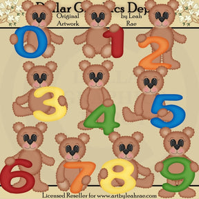 Esta colección incluye adorables ositos de peluche marrones con coloridos números del 0 al 9. Este conjunto contiene 10 gráficos.