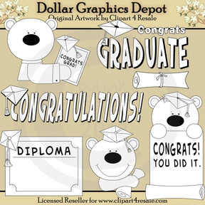 Esta colección incluye un lindo osito que sostiene una tarjeta de graduación y un birrete de graduación, un lindo osito que lleva un birrete de graduación y sostiene un diploma, un lindo osito que lleva un birrete de graduación y sostiene un pergamino que dice: "¡Felicidades! Lo lograste". ", un diploma con un birrete de graduación y dos gráficos de palabras de graduación: "¡Felicidades, graduado" y "¡Felicitaciones!" Este conjunto contiene 6 sellos digitales.