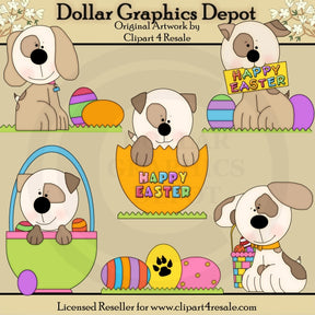 Esta colección incluye adorables cachorritos con manchas, parches de césped, huevos de Pascua pintados, un huevo de Pascua agrietado con la palabra "Feliz Pascua", cestas de Pascua llenas de huevos de Pascua pintados y un letrero de "Feliz Pascua". Este conjunto contiene 6 gráficos.