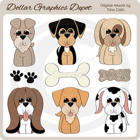 Esta colección incluye seis adorables cachorros: Schnauzer, Coonhound, Beagle, Basset Hound, Golden Retriever y Dálmata, huellas de patas de perro, un hueso de perro y un gráfico con la palabra "Perros". Este conjunto contiene 9 gráficos.