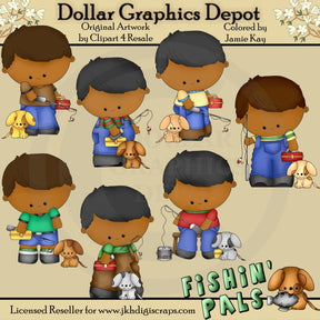 Esta colección incluye siete niños pequeños adorables, con cañas de pescar y flotadores, cajas de aparejos, un cubo de pesca, un banco de madera, adorables cachorritos y un gráfico de palabras "Fishin' Pals", con un cachorrito y un pez. Este conjunto contiene 8 gráficos.