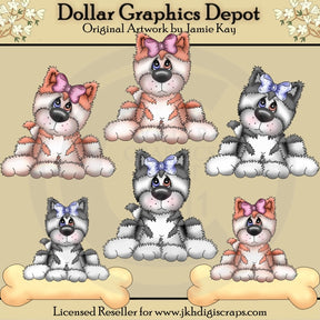 Esta colección incluye seis adorables cachorros de husky con rayas grises y blancas y naranjas y blancas, cada uno con bonitos lazos para el pelo y dos con huesos de perro. Este conjunto contiene 6 gráficos.