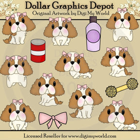 Esta gran colección incluye diez adorables cocker spaniels marrones y beige, cinco tienen lazos dobles para el cabello y cinco tienen lazos simples para el cabello: dos de pie, dos caminando y seis sentados, una lata de comida para perros, una botella de champú para perros, un perro. juguete y un bonito lazo rosa. Este conjunto contiene 14 gráficos.