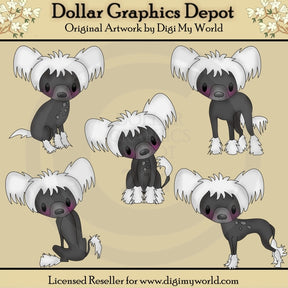 Esta colección incluye cinco adorables cachorritos de cresta china de color gris carbón y blanco, con pequeñas manchas grises y mejillas rosadas: dos de pie y tres sentados. Este conjunto contiene 5 gráficos.