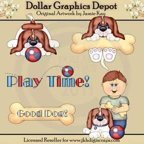 Esta colección incluye cachorros rojos y blancos: uno con una pelota de juguete, otro sujetando un hueso de perro y otro con una pelota de juguete, un hueso de perro y un dulce niño, un hueso de perro con la palabra "Buen Perro". y una pelota que rebota, gráfico de palabras "Play Time". Este conjunto contiene 5 gráficos.