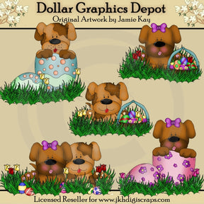 Esta colección incluye adorables cachorritos, huevos de Pascua de colores, bonitos parches de hierba, hermosas flores primaverales, cachorritos asomando entre huevos pintados y cestas de Pascua llenas de bonitos huevos pintados. Este conjunto contiene 5 gráficos.