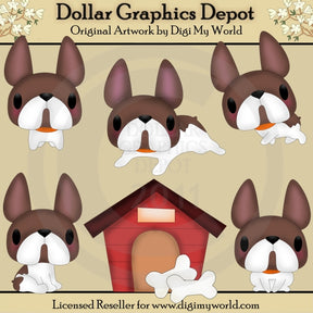 Esta colección incluye cinco adorables bulldogs con manchas marrones y blancas: uno de pie, uno corriendo, uno caminando y dos sentados, una casa para perros pintada de rojo y marrón y dos huesos de perro. Este conjunto contiene 7 gráficos.