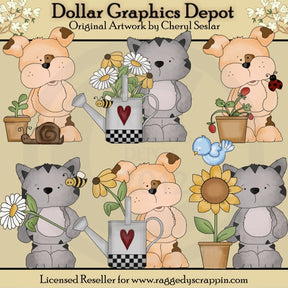 Esta colección incluye adorables cachorros con manchas color canela y marrón, lindos gatitos con rayas grises y negras, una plántula, un caracol de jardín, regaderas de metal con margaritas amarillas y blancas, abejorros, una planta de fresa, una mariquita, una bonita margarita, un planta de girasol y un pajarito azul. Este conjunto contiene 6 gráficos.