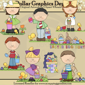 Esta colección incluye tres niños pequeños vestidos con vaqueros azules, pantalones de vestir, camisetas, camisa de vestir y corbata, tres niñas pequeñas con bonitos vestidos de Pascua, lazos para el pelo a juego y un bonito gorro de Pascua, cestas de Pascua llenas de huevos de colores, parches de hierba, bonitas flores de tulipanes, lindos pollitos de Pascua, un adorable conejito de peluche, huevos de Pascua pintados, una colorida canasta de Pascua, con un bonito lazo y muchos huevos de Pascua pintados, y un gráfico con la palabra "Búsqueda de huevos de Pascua" con un parche. de hierba, cestas de Pascua, huevos de Pascua pintados, lindos pollitos de Pascua y un lindo conejito de Pascua. Este conjunto contiene 8 gráficos.