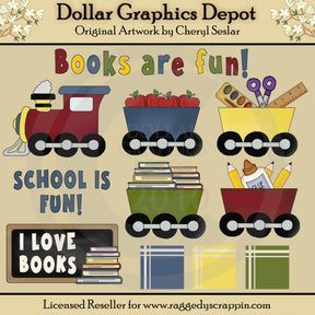 Esta colección única solo está disponible en Digital Craft Supplies. Este juego incluye un juego de tren choo choo de cinco piezas con manzanas, libros, tijeras, regla, lápices, pegamento y pintura, tres gráficos de palabras: "Los libros son divertidos", "La escuela es divertida" y "Me encantan los libros". " y tres fondos a juego en azul, amarillo y verde. Este conjunto exclusivo contiene 11 gráficos.