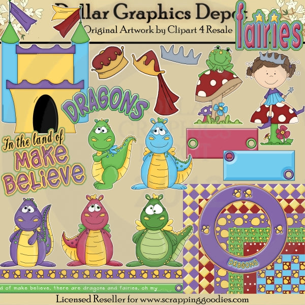 Esta colección incluye un marco redondo de 5" x 5" con huellas de patas de dragón y arte de la palabra "Dragones", dos cintas a juego de 12", una con huellas de patas de dragón y otra con "En el mundo de la fantasía, hay dragones y hadas. "Oh My", seis papeles de desecho coordinados de 12" x 12" (3600 x 3600 píxeles) y dieciséis elementos imaginarios: dos etiquetas rectangulares en azul y rosa, cinco dragones coloridos, un castillo de cuento de hadas, un sombrero de rey, un un sombrero de reina, una corona plateada, una rana sentada sobre un hongo moteado, un hada sentada sobre un hongo moteado y tres gráficos artísticos con palabras de fantasía: "En la tierra de la fantasía", "Dragones" y "Hadas". el juego contiene 25 piezas.