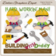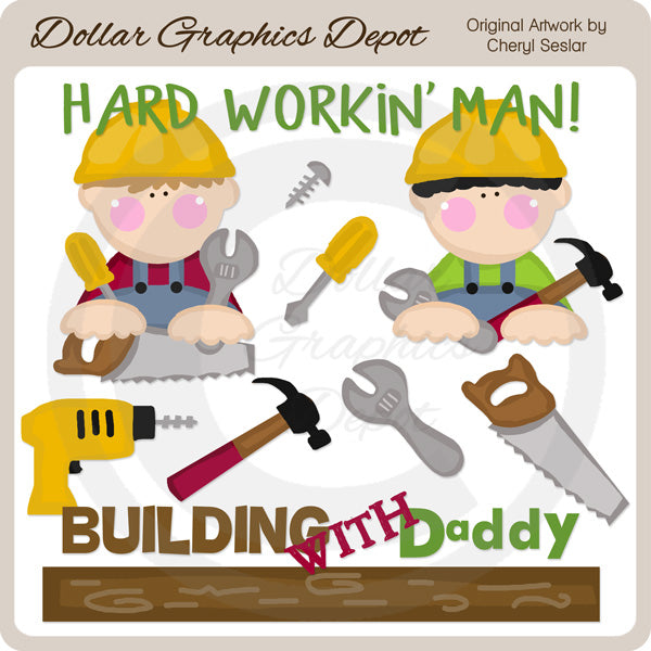 Esta colección incluye dos hombres con overoles y cascos, sierras, llaves inglesas, martillos, destornilladores, un tornillo, un taladro eléctrico, una tabla de madera y dos gráficos con palabras: "Hard Workin' Man" y "Building With Daddy". Este conjunto contiene 11 gráficos.