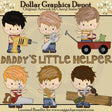 Esta colección incluye seis niños pequeños, vestidos con jeans azules y camisetas a rayas, un taladro eléctrico, una llave inglesa, alicates de punta fina, una carreta roja, una ranita, destornilladores, una sierra de mano, un martillo, una tabla de madera y un " Gráfico de arte de palabras "El pequeño ayudante de papá". Este conjunto contiene 7 gráficos.