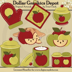 Esta colección incluye una tarta de manzana, una manzana roja y rodajas de manzana, manzanas verdes y rojas y una rodaja de manzana, un guante de cocina, una agarradera, un azucarero, un bote de harina, un bote de azúcar y un salero y pimentero. . Este conjunto contiene 8 gráficos.