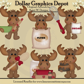 Esta colección única solo está disponible en Digital Craft Supplies. Este juego incluye seis adorables alces para hornear, tazones para mezclar, rodillos de madera, sacos de harina, un batidor, una bolsa de azúcar, una cuchara de madera con un bonito lazo, una botella de extracto de vainilla y un pastel de chocolate en capas con huellas de alce. Este conjunto exclusivo contiene 6 gráficos.