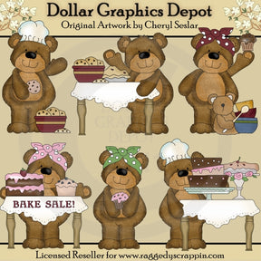 Esta colección incluye seis ositos adorables, con gorros de chef y lindos lazos para el cabello, tazones pintados llenos de galletas con chispas de chocolate, mesas de madera con lindos manteles, arte con palabras "Bake Sale", pasteles recién horneados, pastelitos glaseados con chispas, un muffin de arándanos, Pasteles en capas bellamente decorados, bonitos pedestales para pasteles y un osito pequeño jugando con tazones para mezclar y una cuchara de madera. Este conjunto contiene 6 gráficos.