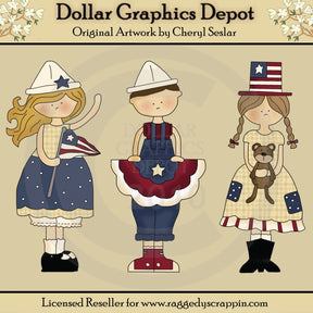 Esta colección incluye una niña con un bonito vestido y un gorro de marinero con una estrella, enarbolando una bandera estadounidense, un niño con un mono de mezclilla azul, una camiseta roja y un gorro de marinero, sosteniendo banderines rojos, blancos y azules, y una niña pequeña con un bonito vestido con parches y un gorro patriótico, sosteniendo un lindo osito de peluche. Este conjunto contiene 3 gráficos.
