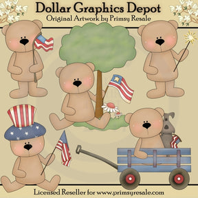 Esta colección incluye cinco lindos ositos patrióticos, un trozo de césped, un árbol, bonitas margaritas, un sombrero de copa rojo, blanco y azul, banderas estadounidenses, una bengala, una carreta pintada de azul y un lindo cachorrito. Este conjunto contiene 5 gráficos.