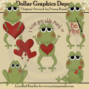 Esta colección incluye cinco adorables ranas de San Valentín: una con un corazón rojo festoneado, una con globos en forma de corazón, una con un pincel y un letrero pintado que dice "Be Mine", una con bonitas rosas rojas y otra con un corazón rojo y " Te amo tanto", arte de la palabra. Este conjunto contiene 5 gráficos.
