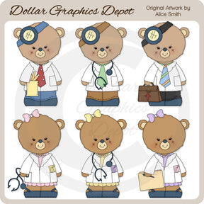 Esta colección única solo está disponible en Digital Craft Supplies. Este conjunto incluye ositos doctores con batas blancas, corbatas, faros, depresores de lengua, un estetoscopio y un maletín médico, y ositos doctoras con batas blancas, lindos lazos para el cabello, estetoscopios, notas de prescripción y un historial del paciente con bolígrafo. Este conjunto exclusivo contiene 6 gráficos.