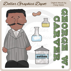 Esta colección incluye a George W. Carver, un maní, un frasco de algodón, dos frascos y un gráfico con palabras "George W. Caver". Este conjunto contiene 6 gráficos.
