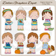 Esta colección incluye ocho adorables niños y niñas del Día de Acción de Gracias, vestidos con overoles y algunos con sombreros de peregrino e indio, un plato de panecillos, una pierna de pavo, un plato de salsa de arándanos, un plato de puré de papas y una salsera llena de salsa, un cazuela de verduras, un pastel de calabaza recién horneado, calabazas de otoño, un pavo asado en una fuente, una rebanada de pastel de calabaza con crema batida y un lindo pavo pequeño. Este conjunto contiene 8 gráficos.