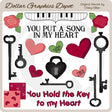 Esta gran colección incluye cinco llaves negras, un candado de corazón negro, una rosa rosada, una rosa roja, un piano, un corazón rosa, un corazón rojo, tres corazones de conversación con las palabras "Cute", "Love You" y "True Love". arte, dos fondos coordinados (corazones y lunares) y dos gráficos de palabras: "Pones una canción en mi corazón" y "Tienes la llave de mi corazón". Este conjunto contiene 18 gráficos.