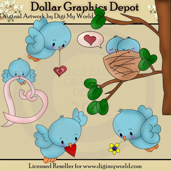 Esta colección incluye seis dulces pajaritos azules: uno volando con un corazoncito atado a una cuerda, otro volando con un bonito corazón rosa, otro volando con un corazón rojo en la boca, otro volando con una bonita flor y dos sentados en un nido de pájaro, en la rama de un árbol. Este conjunto contiene 5 gráficos.