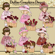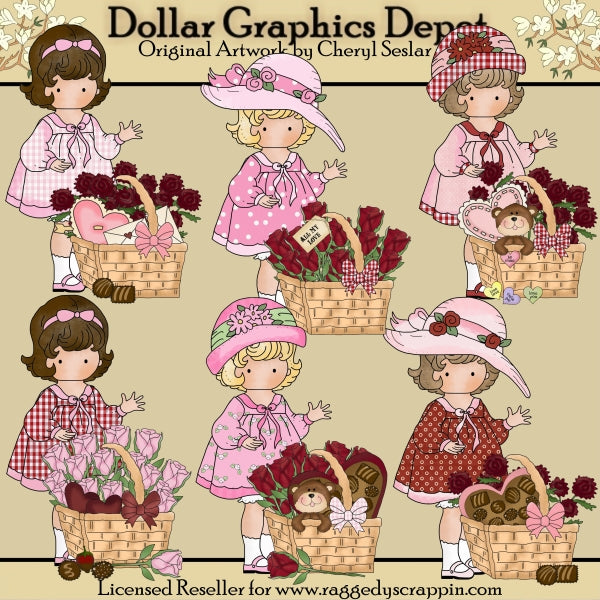 Esta colección única solo está disponible en Digital Craft Supplies. Este conjunto incluye seis adorables niñas, vestidas con vestidos de cuadros, lunares y flores, bonitos sombreros florales y lazos para el cabello a juego, en rosa, rojo, verde y blanco, y hermosas cestas tejidas llenas de rosas rojas, rosas rosadas, pequeñas. corazones rojos, corazones festoneados de color rosa, cajas de chocolate en forma de corazón, tarjetas de San Valentín en sobres, dulces de chocolate, corazones de conversación, una fresa cubierta de chocolate, lindos ositos de peluche, bonitos lazos y una etiqueta de regalo que dice "Todo mi amor". Este conjunto exclusivo contiene 6 gráficos.