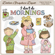 Esta colección incluye una mamá con bata, pantuflas de conejito, envoltura para el cabello y una gran taza de café, un niño pequeño con pijama, pantuflas de osito y un osito de peluche, una niña con camisón, pantuflas de conejito y lazo para el cabello. y una muñeca de trapo, un cachorrito moteado con un periódico, una caja de cereal, un plato de desayuno con huevos, papas fritas caseras y tocino, una taza de café con un periódico enrollado y un mensaje de "No hago". Gráfico de arte de palabras "Mañanas". Este conjunto contiene 8 gráficos.
