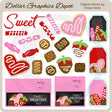Esta gran colección incluye seis trufas de chocolate, seis dulces de San Valentín envueltos, dos galletas heladas en forma de corazón, dos fresas cubiertas de chocolate, un gráfico con la palabra "Sweet", dos adornos para bolsas a juego y tres etiquetas de regalo a juego. Este conjunto contiene 22 piezas (17 gráficos y 5 imprimibles).