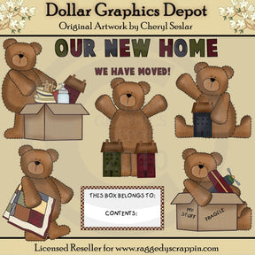 Esta colección incluye dos ositos que empaquetan cajas de mudanza, incluida una casa elegante, muñecos de jengibre, tazones para mezclar, un paño de cocina, un dispensador de bomba y un avión de juguete, un osito con dos casas elegantes y un arte con palabras que dice "Nos hemos mudado", un osito con una bonita manta acolchada, un osito saludando con una casa elegante, una etiqueta que dice "Esta caja pertenece a -y- contenido" y un gráfico con palabras "Nuestro nuevo hogar". Este conjunto contiene 7 gráficos.