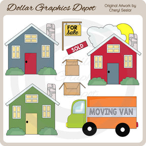 Esta colección incluye tres casas coloridas con chimeneas de adoquines y arbustos verdes, una camioneta de mudanzas, el sol con nubes, un letrero de "Se vende", un letrero de "Vendido" y cajas de mudanza. Este conjunto contiene 9 gráficos.