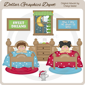 Esta colección incluye un niño durmiendo en una cama de madera con un edredón de lunares azules y una almohada, una niña durmiendo en una cama de madera con un edredón de lunares rojos y una almohada, una alfombra roja, una alfombra azul, una mesita de noche de madera con leche y galletas para Papá Noel, una ventana de madera con una cenefa de cortina verde, la luna, las nubes, un pino nevado y nieve cayendo, una impresión artística de "Dulces sueños" en un marco de madera, un cuadro de "Ahora me acuesto para Impresión artística "Dormir" en un marco de madera y un lindo ratoncito con un gorro de Papá Noel. Este conjunto contiene 9 gráficos.