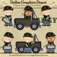 Esta colección incluye seis muchachos del ejército con jeans azules, camisetas de camuflaje, gorras del ejército, placas de identificación, jeeps del ejército y un gráfico con la palabra "Ejército". Este conjunto contiene 6 gráficos.